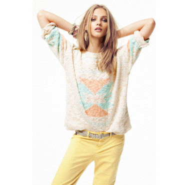 -Si vous trouvez que vos tenues en couleurs claires ou pastelles sont trop fades, je vous recommande d ajouter comme haut un pull tres leger blanc cassé avec des couleurs pastelles ou claires qui rappellereont votre bas. Voici un exemple de chez mango tres reussi;